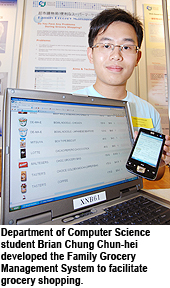 Student Brian Chung Chun-hei, from the Department of Computer Science, developed the Family Grocery Management System. Family members can create a shopping list through a computer or PDA. The system can suggest what to buy based on past shopping preferences and issue a reminder to buy groceries that will soon be used up.