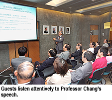 In the company of a diverse audience of more than 40 people, Professor Chang discussed the challenges facing Hong Kong. Dr Norman Leung Nai-pang, University Pro-Chancellor; Mr Chung Shui-ming, Council Chairman, Professor Way Kuo, President of CityU, and Ms Elizabeth Wang Ming-chun, Honorary Doctor of Letters, also took part in the function.
