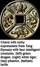 The exhibits are categorised in terms of their content. They include amulets, or charms, with motifs believed to bring luck; coin inscriptions; signs of the zodiac; gods, demigods and auspicious animals; and charms of unusual shape and design.