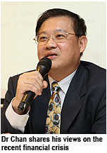 These are some of the questions people are asking in light of the most recent financial turmoil. The Development and Alumni Relations Office and the Convocation invited Dr Chan Yan-chong, Associate Professor of the Department of Management Sciences, to analyse for alumni the current financial crisis and its impact on the Hong Kong economy, on 17 September.