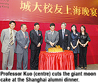 Speaking at the reunion dinner, Professor Kuo expressed gratitude to alumni for their support of their alma mater over the years and hoped they would continue to offer their support to the University’s future development. Ms Kathy Chan Yin-ling, Director of the Development and Alumni Relations Office, said, “Our alumni live in every corner of the world. We work very hard to maintain contact with them by organising activities both within and outside Hong Kong to maintain and bolster our strong network.” In addition, she encouraged alumni to take part in the University’s forthcoming 25th anniversary. To celebrate the Mid-Autumn Festival, a giant moon cake was ordered for the dinner party.