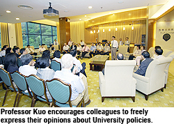 Colleagues asked Professor Kuo questions about the University's policies and made constructive suggestions on issues such as the restructuring of the University and the benchmarks for teaching, research and other services. Professor Kuo responded to each issue in detail.