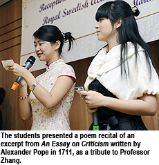 Hosting the reception were two of Professor Zhang’s students, Tang Xiaosha and Zhang Meimei. The pair wore contrasting attire, with Zhang donning the traditional Chinese-style qipao, while Tang dressed in western attire. The sartorial selection was designed to reflect Professor Zhang’s assertion, contrary to Rudyard Kipling, that “the east is east and west is west, and the twain shall meet.”
