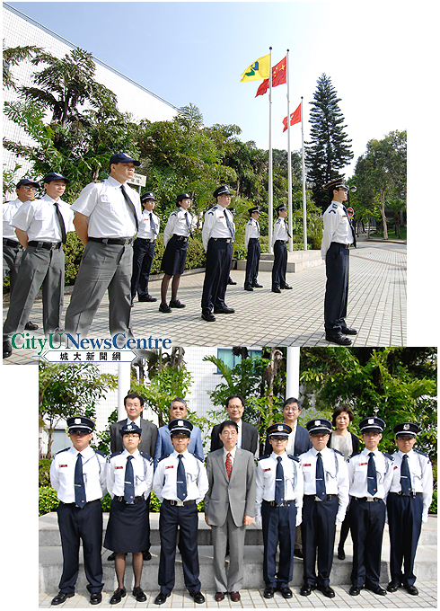 In a solemn ceremony, colleagues and students gathered at University Circle at 8:30am to witness the student flag guards raise the National Flag, the Regional Flag of the Hong Kong Special Administrative Region and the CityU Flag as the national anthem played. Professor Way Kuo, President of CityU, Professor Paul Lam Kwan-sing, Vice-President (Student Affairs), and Professor Julia Tao Lai Po-wah, Chief-of-Staff and Acting Vice-President (Development and External Relations), attended the ceremony.