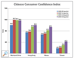 The 2009 third quarter Chinese Consumer Confidence Index results showed that overall confidence in mainland China ranked top (98.6) among the four locations, although it has slightly dropped for two consecutive quarters. Hong Kong placed second (90.3), followed by Macau (87.1) and Taiwan (61.2).
