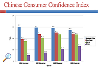 Though people in mainland China, Macau, Hong Kong and Taiwan are optimistic about economic development, they were less satisfied with consumer prices. The decrease of confidence in consumer prices was most obvious in mainland China. The score was 14.4% lower than last quarter and nearly 30% lower than the first quarter. Confidence in housing purchases was at a record low on the mainland (68.2), in Hong Kong (66.3) and Macau (44.4).