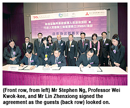 CityU’s College of Business signed an agreement with the Treasury Markets Association (TMA), a Hong Kong Monetary Authority (HKMA) supported institution, and the Shenzhen Flink Training Centre (Flink), under the Shenzhen Financial Electronic Settlement Centre, on 16 March to jointly offer a training programme for the mainland’s banking and financial industries. By integrating the partner institutions’ strengths in professional education, treasury management practice and the financial industry network on the mainland, the programme will develop financial professionals to meet the demand of China’s rapid economic growth.At a ceremony held at the HKMA, the agreement was signed on behalf of the partner institutions by Professor Wei Kwok-kee, Dean of CityU’s College of Business, Mr Stephen Ng, Chief Operations Officer of TMA, and Mr Lin Zhenxiong, Vice General Manager of Flink. Guests at the ceremony included Professor Chan Chi-hou, Acting Provost, CityU; Professor Julia Tao Lai Po-wah, Chief-of-Staff, CityU; Mr Daryl Ho, Head of the Market Development Divison of the Monetary Management Department, HKMA, and Executive Board member of TMA; Mr Wilson Chan, Assistant General Manager, Shanghai Commercial Bank Limited, Mr Tony Wang, Deputy General Manager, Global Markets, Bank of China (Hong Kong) Limited and Mr Xiao Guangchang, General Manager, Shenzhen Financial Electronic Settlement Centre.