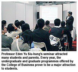 This year CityU bolstered its presence at the Shanghai exhibition. As many as 37 academic and administrative staff took part, including Professor Wei Kwok-kee, Dean of the College of Business, and Professor Johnny Chan Chung-leung, Dean of the School of Energy and Environment. In addition to having a booth in the exhibition hall, the University also held a number of seminars highlighting CityU’s strengths and explaining the courses offered. On the first day of the exhibition, three seminars on CityU’s academic programmes and research work were hosted respectively by Dr Rodney Jones, Associate Head of the Department of English, Professor Eden Yu Siu-hung, Associate Dean of the College of Business, and Professor Johnny Chan Chung-leung.For his seminar, Dr Jones asked Dr Jackie Lou Jia, who recently joined his department as Assistant Professor, to serve as interpreter. Dr Lou came to Hong Kong from Shanghai after completing her middle school education. She received her bachelor degree from CityU, and was then admitted to Georgetown University, Washington, DC, for further studies. Happy to be back at CityU, Dr Lou was eager to share her study experience with middle school students in mainland China and explain to them how CityU had helped her open the door to the world.