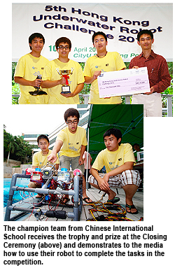 Aimed at enhancing the younger generation's interest in robotic technology and marine conservation, the Hong Kong Underwater Robot Challenge was started in 2006 by CityU and has since then become very popular among secondary school teachers, students and their parents. The competition this year has attracted participation from schools in Macau and international schools in Hong Kong.