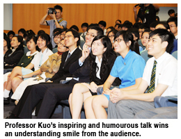 Professor Kuo presented his insightful analysis in an easy-to-understand manner, covering various topics of history, business corporations and higher education. His lively and humourous talk invoked enthusiastic questions from students and received a big applause.