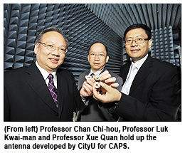 Professor Luk pointed out that the antenna design for CAPS is very complicated. It has to be small but capable of receiving signals transmitted at various angles from satellites moving in different orbits in order to ascertain a position, as well as to receive and transmit voice signals. It is particularly difficult to receive signals transmitted at low angles of elevation.