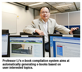 Using information from websites to compile e-books is an emerging research area. Easy to use, an online e-book can cater to the needs of various types of users in different sectors. More importantly, it can help users find the most appropriate information from the Internet. With a personalised searching mode and real-time updates, Professor Li’s system will be a valuable learning tool for the Internet users.