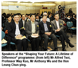 The event was one of the activities of the “Shaping Your Future: A Lifetime of Difference” programme organised by CityU. In attendance were the Hon Leung Chun-ying, Council Chairman of CityU, Professor Way Kuo, University President, Mr Anthony Wu Ting-yuk, Chairman of the Hong Kong Hospital Authority, and Mr Alfred Tsoi, Vice President and Managing Director of Yahoo! Hong Kong.