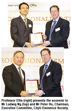 Mr Simon Hui, Function Chairman, 1st Vice President of the Lions Club of Metropolitan Hong Kong and CEO of EPSA Corp Ltd; Mr Ludwig Ng, President of the Lions Club of Metropolitan Hong Kong; and Mr Wilson Chan, Honorary Secretary of the CityU Eminence Society, shared their views on professionalism and encouraged students to learn as much as they can from their seniors so as to better equip themselves.