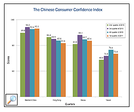 The first quarter results of the Chinese Consumer Confidence Index for 2011 released by CityU on 12 April reveal that overall consumer confidence in Hong Kong declined by 2.4% on the previous quarter, with Taiwan and Macau down by 4.2% and 1.3%, respectively, while mainland China saw confidence increase by 0.5%.