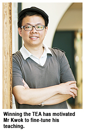 A master’s degree graduate from the Department of Chinese, Translation and Linguistics of City University of Hong Kong in 2006, Mr Kwok said the hardest thing in life is to know oneself and that the TEA reflects how students and colleagues see him.