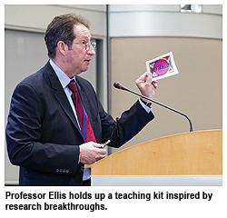 For perspective, Professor Ellis reminded the audience of the rapid advances in technology that have transformed classroom teaching over the past 25 years, revealing how discoveries in the research field have quickly found a place in campus lecture theatres and laboratories. These transformations have allowed teachers to encourage students to work toward the ultimate goal of being creative within an area of scholarship, he said.He cited the discovery of superconductivity in ceramic materials in 1986 by scientists who won the Nobel Prize for Physics the following year as a major breakthrough that led to developing a relatively simple experiment to be used in the lecture theatre to teach complex ideas about atomic structure.