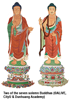 Under the guidance of art historians and experts on the murals, a group of animators used laser-scanned data sets and ultra-high resolution photographs of the north wall provided by Dunhuang Academy to imitate the brush strokes and colour of the originals and to re-draw selected elements on transparent paper. The images created by this meticulous process were digitised and integrated into the animation scenography, including the 3D reconstruction of the illustrated musical instruments and the canopies above the Bhaisajyaguru. The experts even invited members of the Beijing Dance Academy to re-enact the dances in the murals.