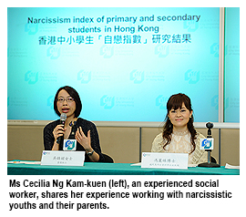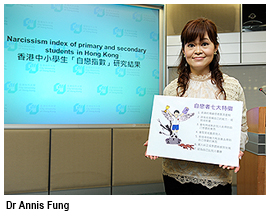 The study, which was conducted by Dr Annis Fung Lai-chu, Associate Professor of CityU’s Department of Applied Social Studies, used a narcissism index to assess 9,432 Primary 3 to Form 5 students at 13 schools in different regions around Hong Kong.