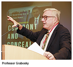 In his talk, Professor Grabosky asked the audience to consider what we mean by “security” and “organised crime” before assessing risks posed by a variety of cybercriminals ranging from groups such as DrinkOrDie, a software piracy group closed down in 2001 by Operation Buccaneer, an international copyright piracy investigation run by the US government, to GhostNet, large-scale cyber-spying identified by the Canadian watchdog Information Warfare Monitor.