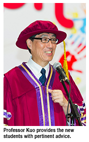 “An old Chinese saying goes, ‘It takes 10 years to sharpen your sword’. The University will give you four years to equip yourselves. You should think carefully about what you are going to do in these four years. You should not only challenge authority but yourselves as well. You may learn from the champion of a pan-European marathon who used to go cycle to school when he was a kid. But his bicycle was stolen and his family could not afford to buy him a new one. So he ran 10 kilometers every day to school. Practising day by day, he became a winner in the end. People who are successful constantly challenge themselves on their road to success,” said Professor Kuo.