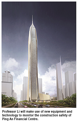 City University of Hong Kong (CityU) has been awarded a contract valued at RMB7.2 million (approximately HK$9 million) to monitor the construction safety and structural health condition of the Ping An Finance Centre, the tallest building in the Greater China Region. Professor Li Qiusheng from CityU’s Department of Civil and Architectural Engineering will use his innovative monitoring system to check the structural performance during its construction and monitor its structural safety after completion of construction.