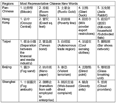 The 2013 LIVAC Pan-Chinese New Word Rosters count new words mainly in regional Chinese newspapers. The following table shows the five most prominent new words: