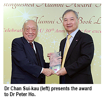 Sir David Akers-Jones, President of the Business and Professionals Federation of Hong Kong, and Dr Chan Sui-kau, Founder of Yangtzekiang Garment Limited, presented the awards to the winners. Other guests included Dr Norman Leung Nai-pang, Pro-Chancellor of CityU and Chairman of the Panel of Judges of the 3rd Distinguished Alumni Award; Mr Joseph Pang Yuk-wing, Treasurer of the University; and Professor Way Kuo, CityU President.