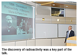 Professor Brézin then took us back to the time of Pierre and Marie Curie and their pioneering work on radioactivity and explained how it led into conceptual questions about energy and matter. Their discoveries—and those of others, such as Ernest Rutherford, who, among many other innovations, outlined the structure of the atom—led to theorising about the nucleus of the atom, half-life decay, isotropes, and the neutron and the neutrino—the last one first hypothesised by Wolfgang Pauli, who said of it: “I have postulated a particle that cannot be detected”.