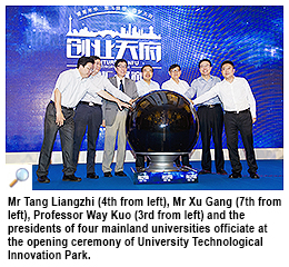 According to the agreement, the Shuangliu Government will provide annual funding and allocate land for constructing the CityUCRI buildings for the use of the University. In the first phase of the construction plan, four buildings with a gross floor area of 18,500 square metres will be completed.On the morning of 24 May, an event titled “Venture Tianfu?JingRongHui” was held by Chengdu Municipal Government in conjunction with CityUCRI and other related government departments and institutes. Mr Tang Liangzhi, Mr Xu Gang, Professor Kuo and the presidents of four mainland universities officiated at the opening ceremony of the University Technological Innovation Park.