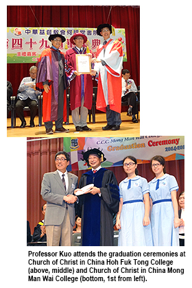 Professor Kuo also attended graduation ceremonies at Church of Christ in China Hoh Fuk Tong College and Church of Christ in China Mong Man Wai College on 23 May and 30 May respectively.Citing the success story of a CityU graduate, Professor Kuo stressed the importance of discovery and innovation.