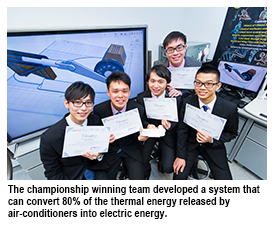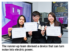 The championship winning students developed a system that can convert 80% of the thermal energy released by air-conditioners into electric energy. The runner-up team devised a device that can turn noise into electric power.
