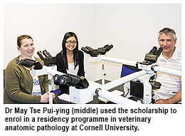 Dr May Tse Pui-ying, who previously worked as a Veterinary Officer (Residues Control) in the government’s Agriculture, Fisheries and Conservation Department (AFCD), will use the scholarship, the first of its kind in Hong Kong, to enrol in a residency programme in veterinary anatomic pathology at the College of Veterinary Medicine, Cornell University.