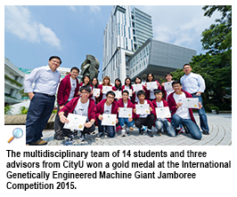 The team of 14 students from the Department of Biology and Chemistry (BCH), Department of Biomedical Sciences (BMS) and Department of Mechanical and Biomedical Engineering (MBE) competed with around 2,700 participants from 279 multidisciplinary teams from all over the world to win the top award at the International Genetically Engineered Machine (iGEM) Giant Jamboree Competition 2015.For the second year in a row, CityU was awarded the Gold medal at the iGEM Competition. Last year, CityU was awarded the Gold medal at the 2014 iGEM Competition for their genetic solution using genetically-modified E. coli to tackle obesity.