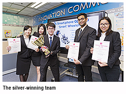 The silver-winning team was formed by Lam Wah-shing from the Department of Mechanical and Biomedical Engineering, Sylvia Lee See-wai from the Department of Linguistics and Translation, Leung Chiu-yee from the Department of Architecture and Civil Engineering, He Danyun from the Department of Management, and Revanth Banala Nithyanandam from the Department of Electronic Engineering.They developed a self-transformable wheelchair that users operate and control via an app to move upward or forward as well as to turn left or right.