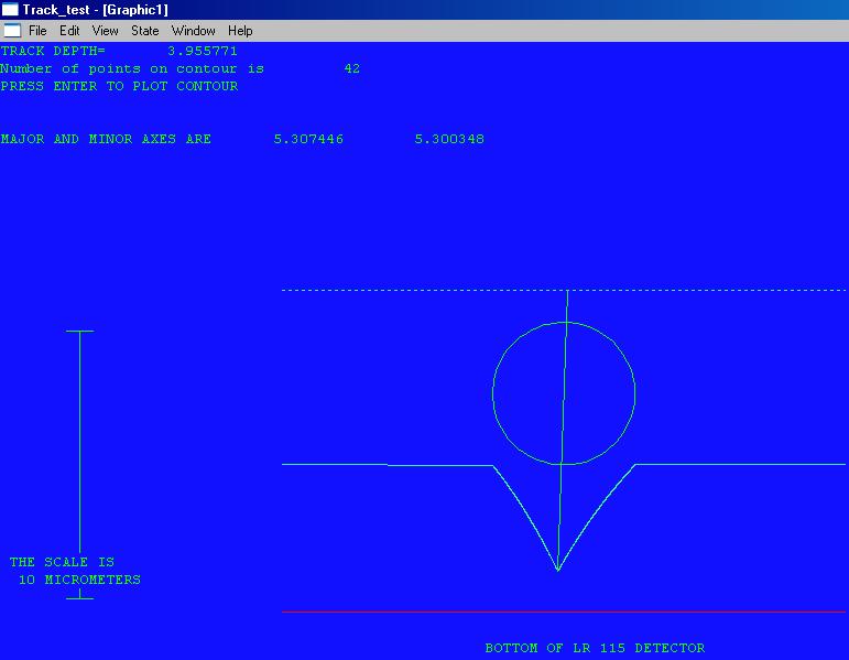 The outputs of the program are the lengths of the major and minor axes of the track opening, as well as the track depth. The program also plots on the computer screen the following: the initial detector surface, the detector surface after etching, the profile of the track, the contour of the track opening and the trajectory of the particle. If the calculations are performed for the LR 115 detector, the lower boundary of the sensitive layer is also plotted in red color (assuming an initial thickness of 12 mm for the active layer). For this detector, the track is plotted in both cases, i.e., (1) when the sensitive layer is perforated by etching, as well as (2) when the sensitive layer is not perforated by etching. The portion of the track below the bottom of the sensitive layer, if any, is also plotted, which will be useful for studying a sensitive layer thicker than the nominal value of 12 mm.