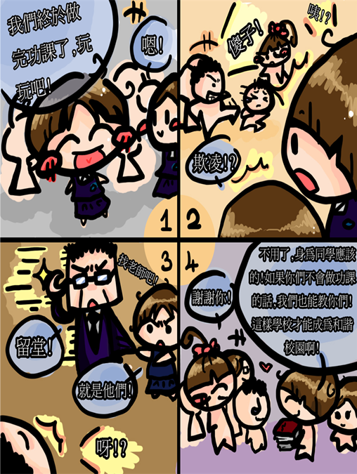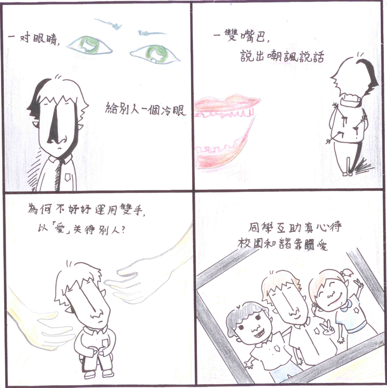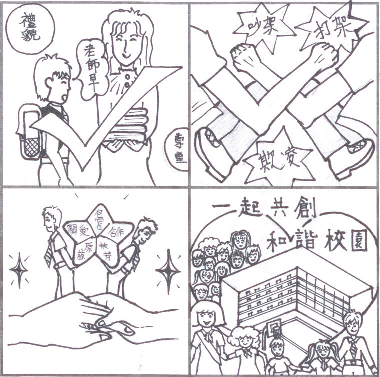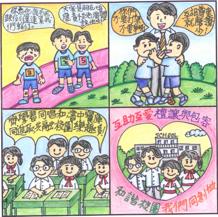 為了提升同學及大眾對和諧校園的意識,本計畫於09-10及10-11年度舉辦了「四格漫畫創作比賽」。 對象: 全港小四至中七學生 組別: 小學組 (小四至小六級) 、初中組(中一至中三級)及高中組(中四至中七級) 四格漫畫主題: 鼓勵同學彼此尊重,互相包容,同創和諧共融校園 獎項: 各組分別設冠、亞、季軍各一名及優異獎五名 所有得獎作品已刊登在《2009-2011 年度和諧校園口號、四格漫畫創作比賽得獎作品集》,以下將展示各組別冠、亞、季軍作品: 2009-10年度得獎作品