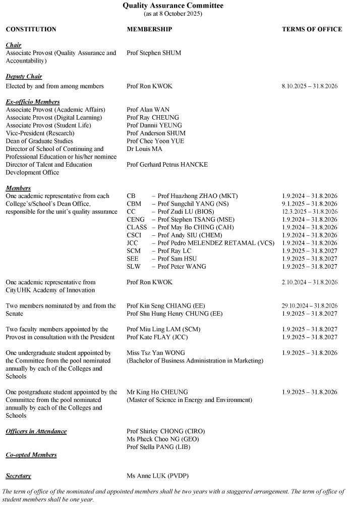 - One academic representative from each College's or School's Deans office, responsible for the unit's quality assurance