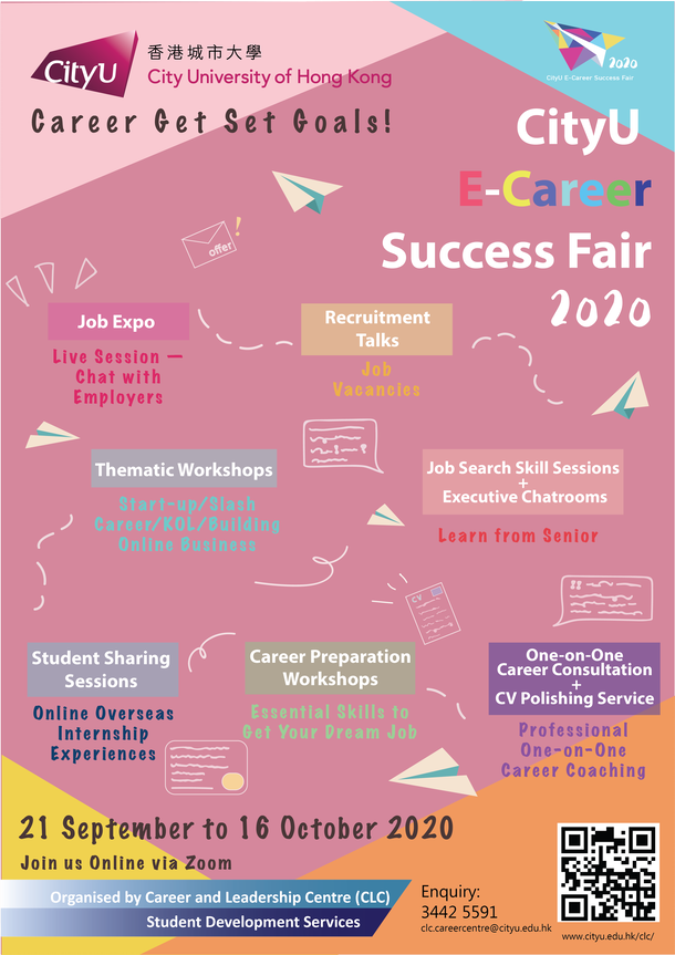 CityU Careers Festival is an institutional annual event which serves as a platform for students to deepen their understanding on employers’ expectations, gain job opportunities and keep abreast of the market trend from participating companies and their representatives. It also brings in prospective employers from the public and private sectors, NGOs and industry practitioners to introduce their industrial prospects, expectations to employees and entry qualifications. Due to Covid-19 pandemic and the experience of initiating the CityU “Career Month” held in May-June 2020, this year the CityU Careers Festival has been transformed into a month-long virtual event with more enhanced features - CityU E-Career Success Fair 2020, and will cover various online career preparation and development activities together with an online Job Expo!