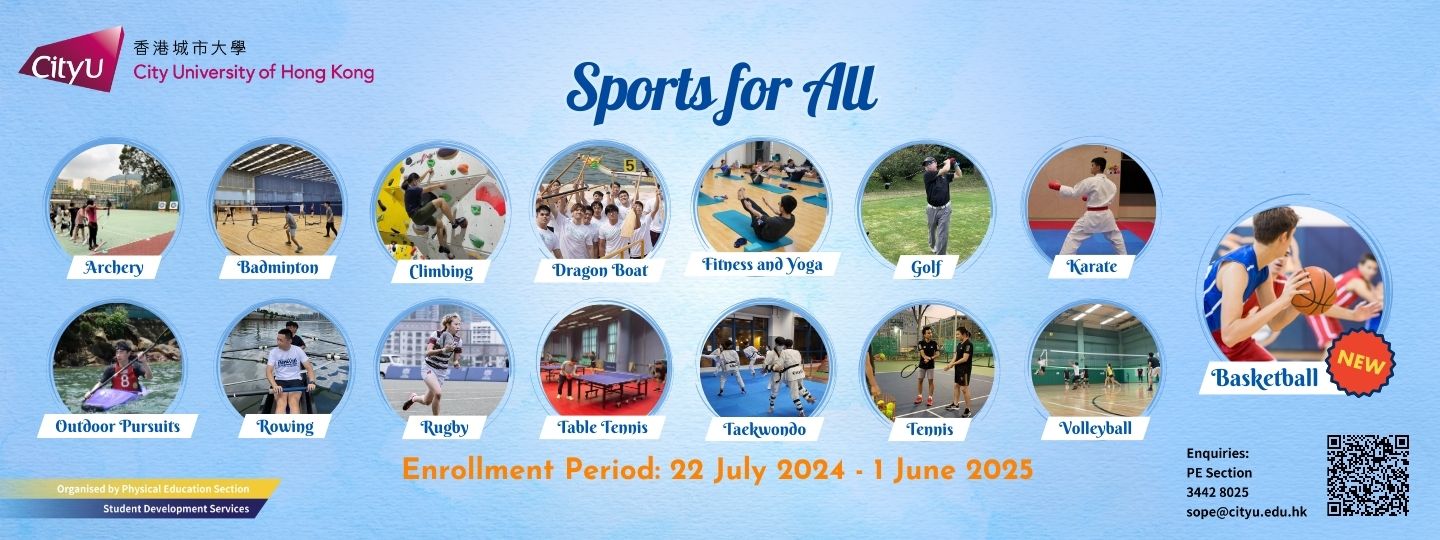 "Sports for All" is a year-round programme conducted by various sports clubs, with aims to promote physical exercise, cultivate exercise habits as well as develop individual sports potentials among the CityUHK Community.