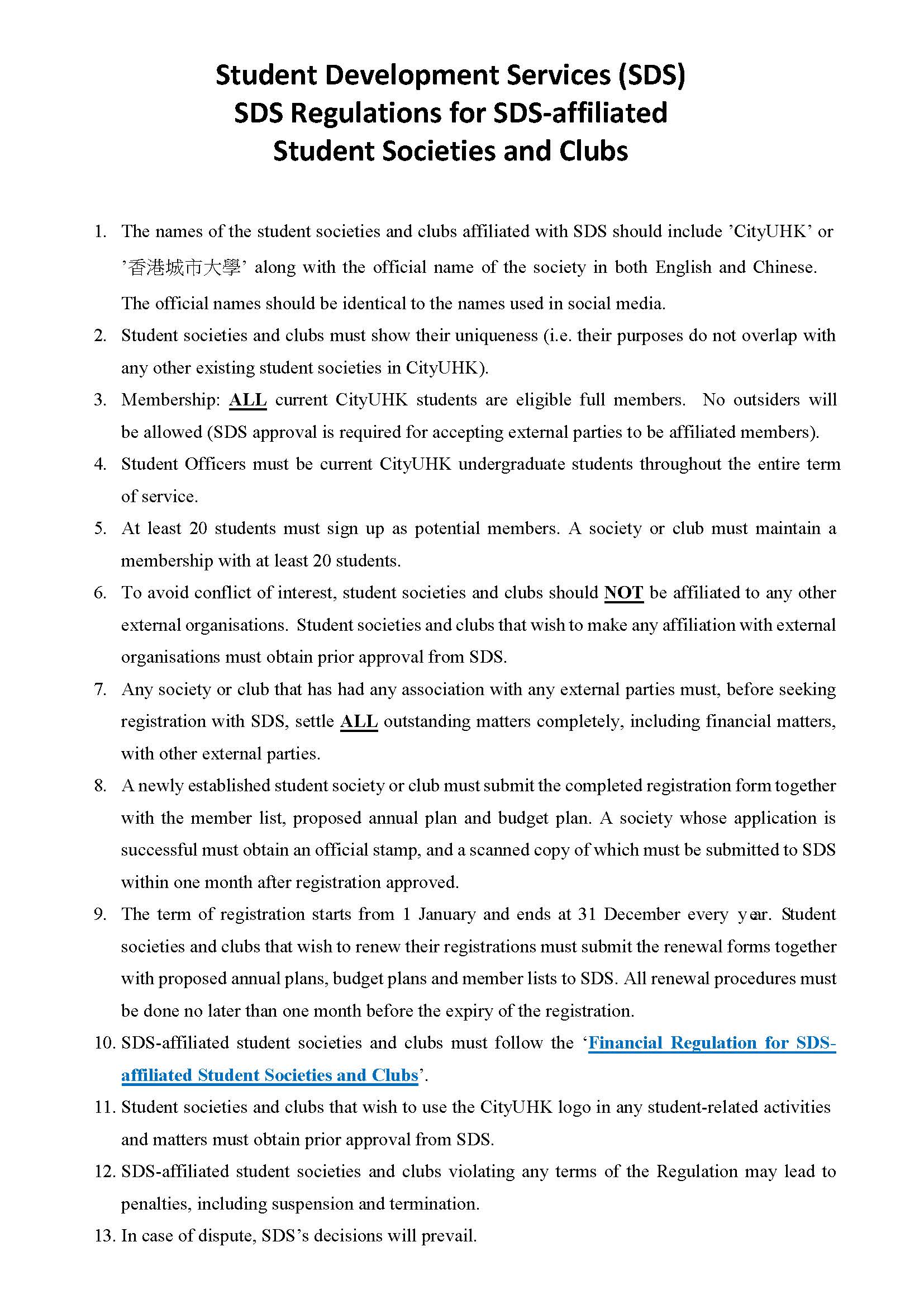 - All registered student societies and clubs must comply with the 'SDS Regulations for SDS-affiliated Student Societies and Clubs'.