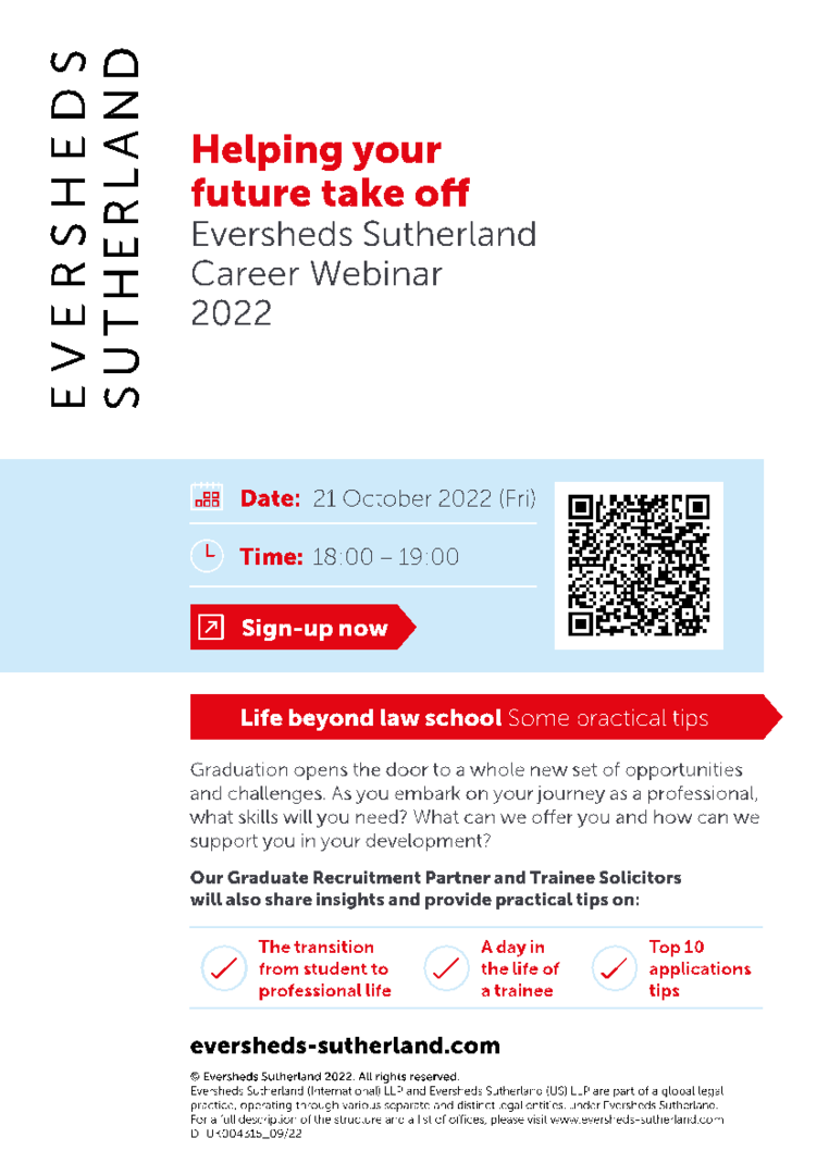 “Helping your future take off” by Eversheds Sutherland (Webinar) Date: 21 October 2022 Time: 6:00 pm – 7:00 pm Event Speaker/Speakers Mr. Dickson Ng, Graduate Recruitment Partner and Partner of the Corporate Team
