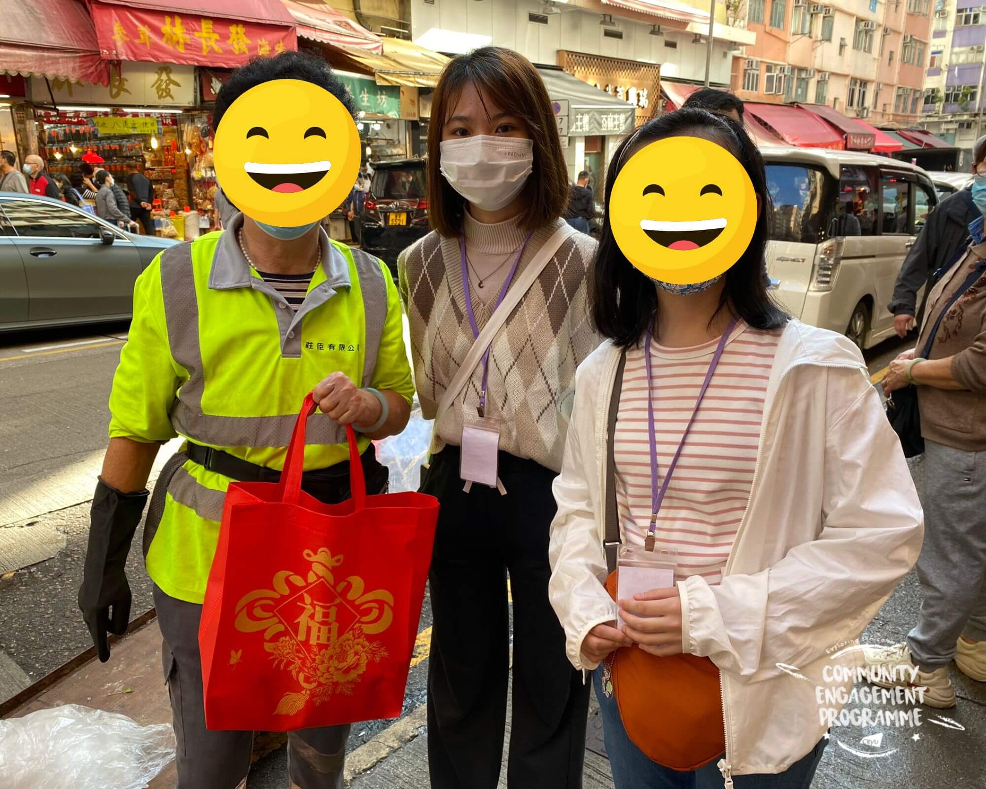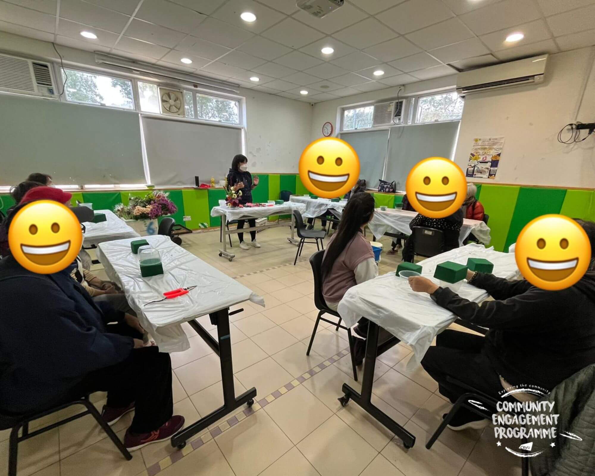 With the easing of the pandemic and the beginning of the new semester. CEP volunteers devoted more time to in-person services, such as making handicrafts for the elderly and celebrating Lunar New Year together on 10 January and 11 January, Caring for the ragpickers and street cleaners in Kwun Tong, Joining floral jamming and exhibition tour with the elderly, Food Recycling Tour on 9 January and 12 February, Assisting teenagers to improve communication skills and interpersonal relationship, and Visit to Animal Shelter on 19 January and 14 February.