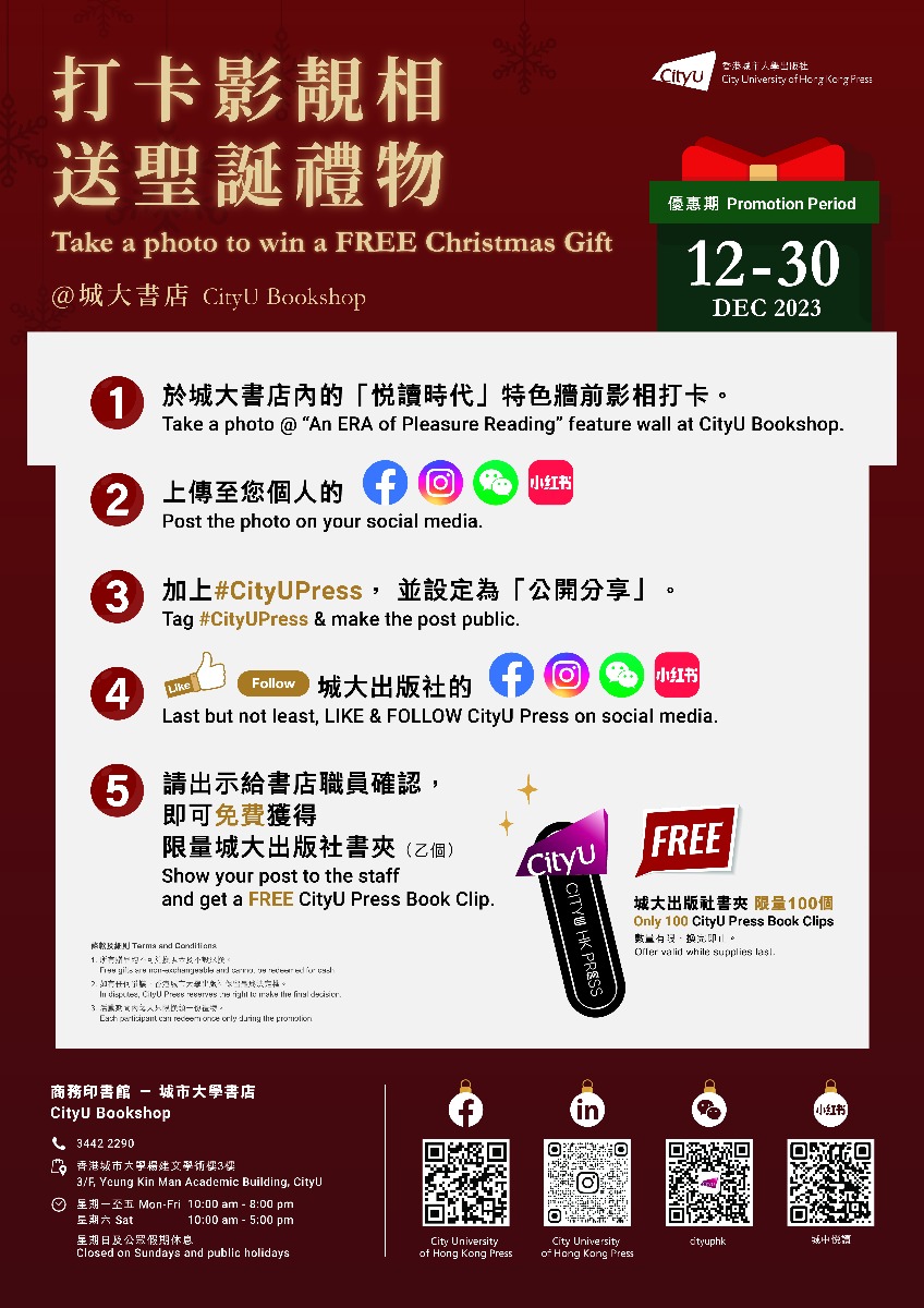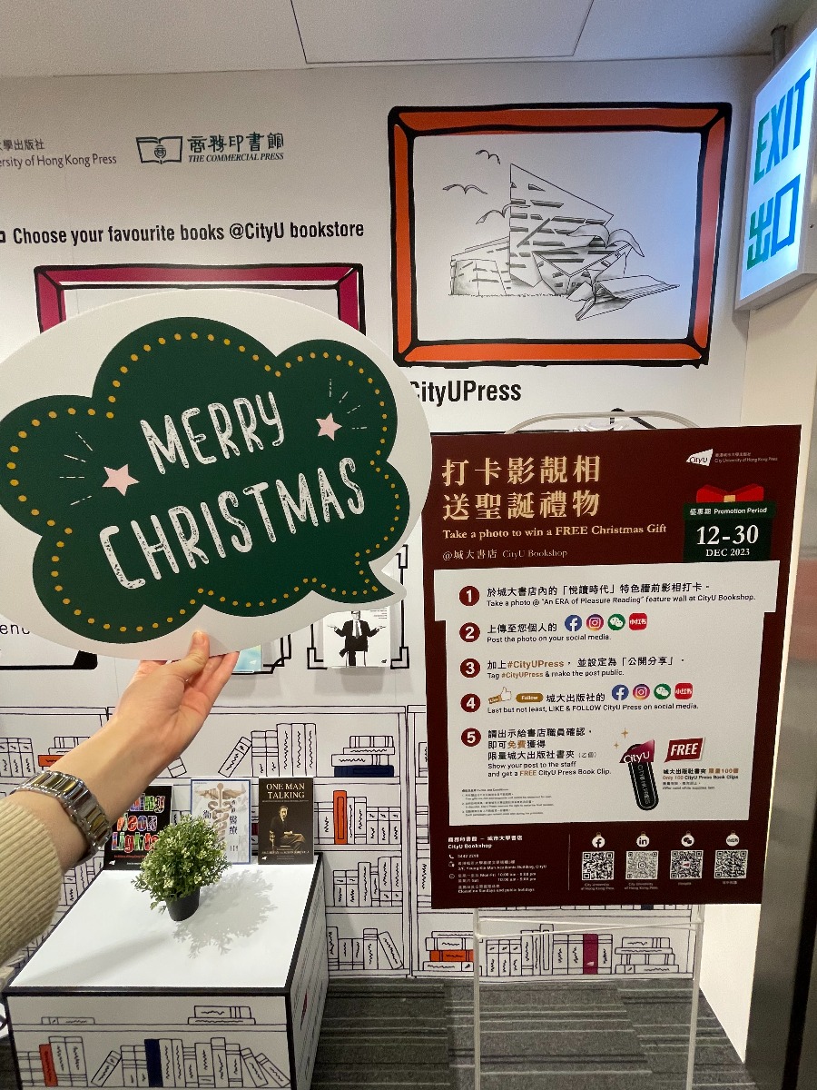 Moreover, you can also get a free CityU Press Book Clip by taking a picture in front of the feature wall with our Christmas photo props, sharing it on social media, and tagging #CityUPress. The first 100 participants can enjoy this free gift from today till 30 December. We would like to spread the book-loving atmosphere across campus, in hopes that everyone can find their favourite books and enjoy reading.