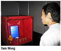 suitable launching point until settling on third-year BACM student and an editor of the Medialogue catalogue, Kirque Leung, who offers to guide me through the Show. "It helps to hear from the artists themselves," he suggests, introducing me to Timothy Lee, whose Final Year Project is entitled 'The day sucked'. Timothy shows me that by using a computer mouse to click on various Chinese characters and pieces of English text that appear in images on a screen, I can create my own story line with one of eight lead characters. "I am interested in writing short stories and making interactive games," Timothy explains. This is fun!Next, I meet Hamlet Lin, Project Manager of the Show and prize-winning School of Creative Media (SCM) student. Hamlet's thesis and installation piece revolve around Wittgenstein's philosophical works. "Philosophy should be like therapy for people," Hamlet expounds, "and bring clarity, rather than confusion." He urges me to pick a word, such as 'Memory', and label something with it. This makes me consider the meanings of words and their relationship to objects, to the world, and to myself. "We don't need to define creativity -- just explore, find a boundary and cross it,"