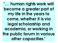 "What is most important to me is never to stagnate, to remain committed to the work I do, and constantly assess what contribution I am making to society," says Raj. "Is what I do of any use, whatsoever? As long as I get a 'yes' to this question, I will continue to work! While predicting the future is the job of astrologers, I can say that human rights work will become a greater part of my life in the years to come, whether it is via legal scholarship and academia, or working in the public forum in various other capacities."