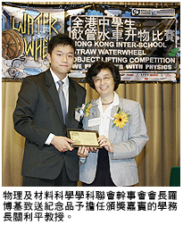 物理及材料科學學科聯會主辦的「全港中學生飲管水車升物比賽」,吸引了逾千名來自本港80所中學的學生參加。各參賽者於今天齊集城大校園,運用所學物理知識及發揮創意,以飲管製造水車升起螺絲帽。