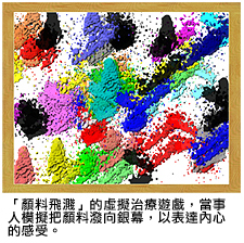「顏料飛濺」為研究小組發(fā)展的其中一項(xiàng)虛擬治療遊戲,治療師會(huì)指導(dǎo)治療對(duì)象選擇不同的顏色,並要求他們模擬把顏料潑向銀幕,從而讓治療師了解當(dāng)事人內(nèi)心的感受。