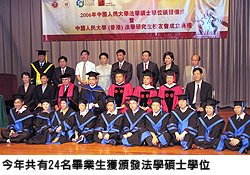 今年共有24名畢業(yè)生獲頒發(fā)法學(xué)碩士學(xué)位。學(xué)位頒發(fā)儀式由人大研究生院常務(wù)副院長吳曉求教授、人大法學(xué)院院長王利明教授及人大法學(xué)院副院長龍翼飛教授主持,並由城大副校長(研究)及研究生院院長王世全講座教授、城大法律學(xué)院院長馬培德講座教授和城大法律學(xué)院副院長梁美芬博士擔(dān)任見證嘉賓。