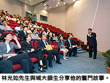 論壇由校長張信剛教授致歡迎辭揭開序幕。由只有一臺舊式二手印刷機的小廠房,發展成為今天業務遍全球的星光集團,林先生白手興家的故事和企業經營的精神,讓在座近百名商學院學生上了寶貴一課。